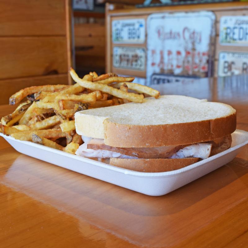 Stopped by Bates City BBQ, to get some sandwiches for the game. I almost always get the turkey, with slaw and beans. They have the most incredible french fries in town, and their ranch is to die for! They are pros with this to go order stuff, and anything that could spill is always wrapped in saran wrap, you got to love it...